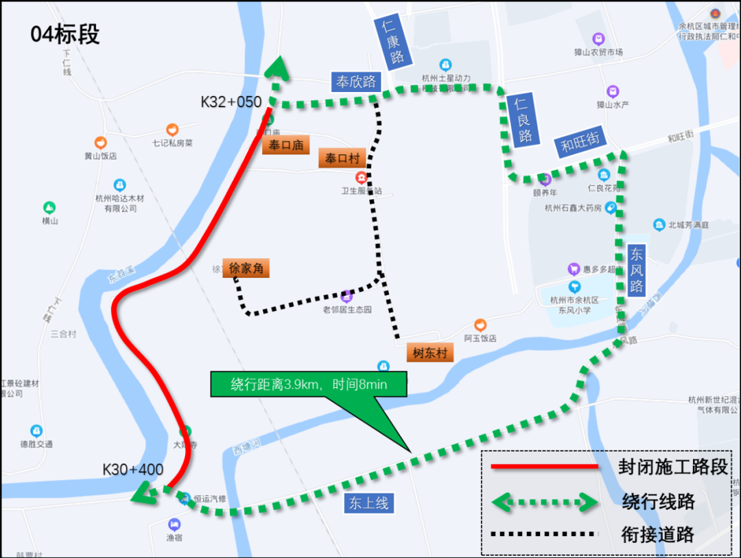 施工期间过境车辆通过东上线、东风路、和旺街、仁良路、奉欣路绕行,沿线单位车辆、行人及非机动车在预留通道内通行。