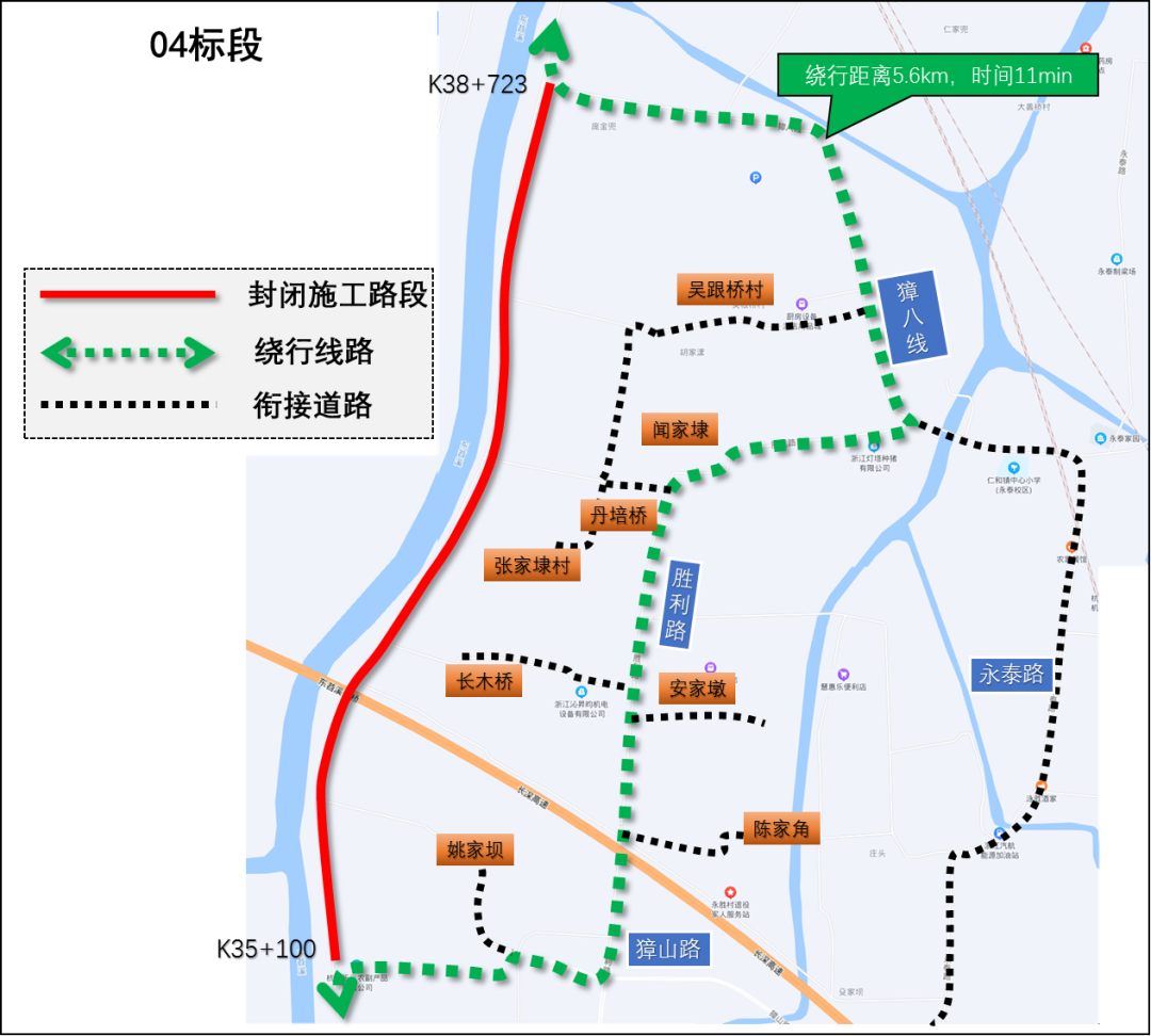 施工期间过境车辆通过獐山路、胜利路、獐八线绕行,沿线单位车辆、行人及非机动车在预留通道内通行。