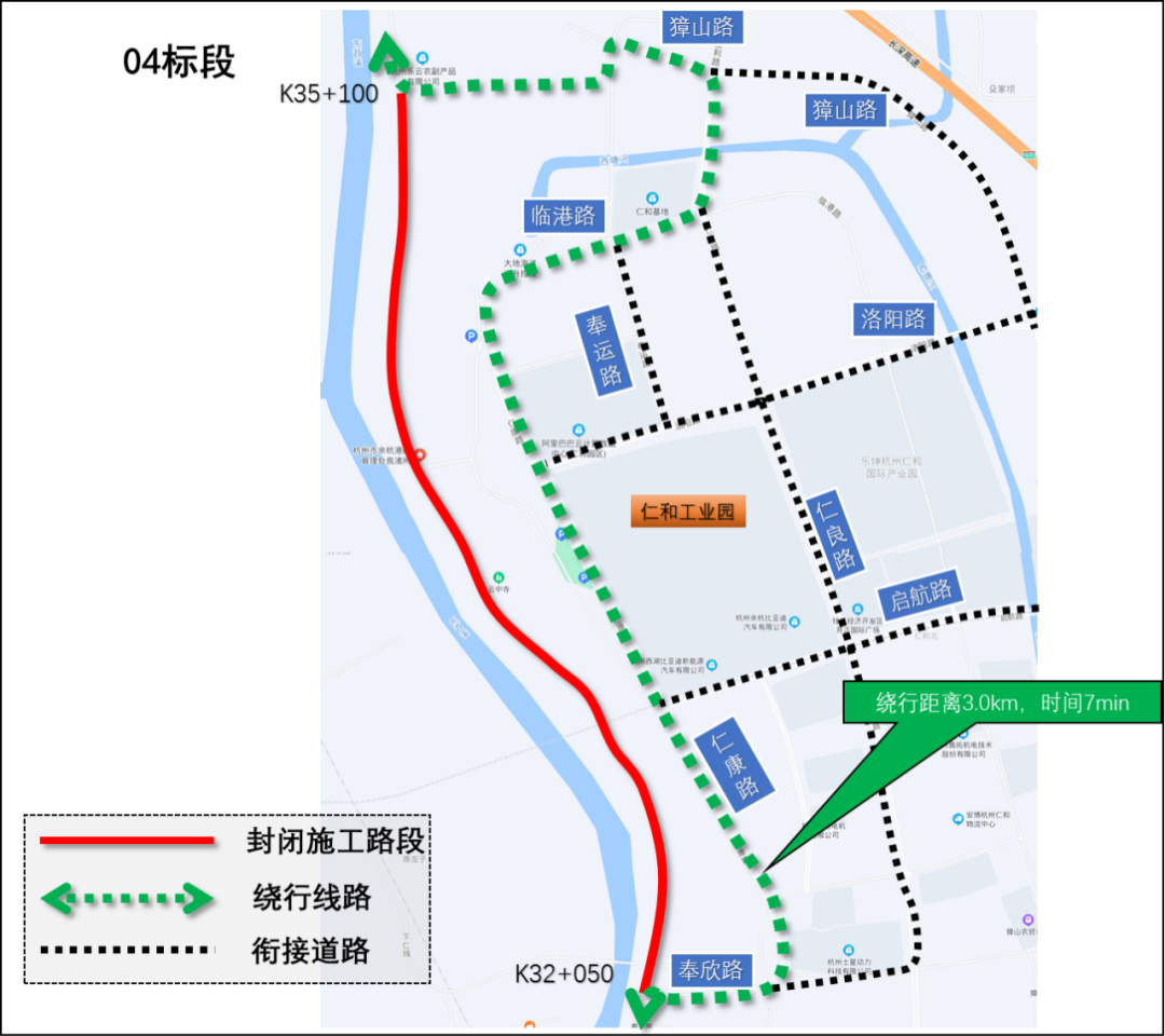 施工期间过境车辆通过奉欣路、仁康路、临港路、獐山路绕行,沿线单位车辆、行人及非机动车在预留通道内通行。