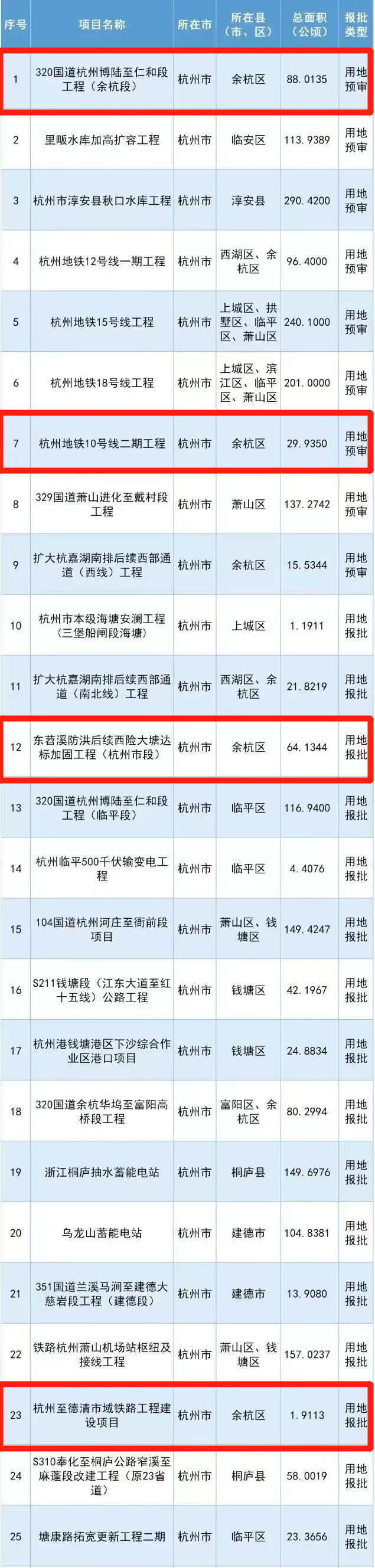 仁和境内4个项目列入全省“百大”!涉及地铁、公路…… 日前,浙江省自然资源厅印发通知,决定开展全省“百大”项目用地报批集中攻坚行动,保障扩大有效投资,强化用地服务保障工作。这四个项目有在仁和境内的,一起了解下↓↓↓ 320国道杭州博陆至仁和段工程 (余杭段) 320国道杭州博陆至仁和段工程(余杭段)起点位于余杭-临平区界线,顺接运河大桥改造工程,终于104国道杭州至绍兴公路(余杭良渚至崇贤段)改建工程(运溪高架路)。路线全长12.89公里,设高架桥约12.47公里;全线设平行匝道6对、枢纽互通3座。 东苕溪防洪后续 西险大塘达标加固工程 (杭州市段) ☀详情阅读相关链接:仁和交通→全封闭施工2年多,过境车辆请绕行 杭州地铁10号线二期工程 杭州地铁10号线二期工程位于余杭区,南起自逸盛路站(不含),北至仁和南站(纳入10号线三期报批),主要沿港虹西路、仁和大道敷设,途经良渚街道、仁和街道。线路全长 5.928千米,全部为地下线。 杭州至德清市域铁路工程 建设项目 杭州至德清市域铁路工程起于仁和北站(含),终于德清高铁站,线路全长25.6公里,建设9座车站,其中余杭段长约1.2公里,建设车站1座。 仁和城事公众号:杭州仁和街道城市建设、设施配套、楼市动态、新闻资讯,仁和新鲜事及时掌握。 👩🏻💻 资料:余杭8个项目列入全省“百大”!涉及地铁、公路……(余杭发布)