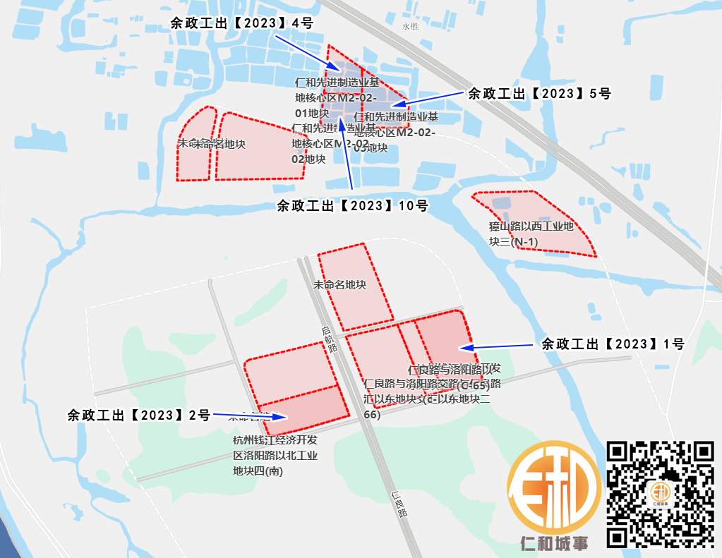 | 5 | 余政工出【2023】10号 | 东至相邻地块、南至獐山路、西至仁良路、北至相邻地块(仁和先进制造业基地核心区M2-02-02地块) | 冠誉鑫科技(杭州)有限公司 | 13334 | 工业用地M2 | 1060 | 1.2-2.5 | 2023年5月15日 |