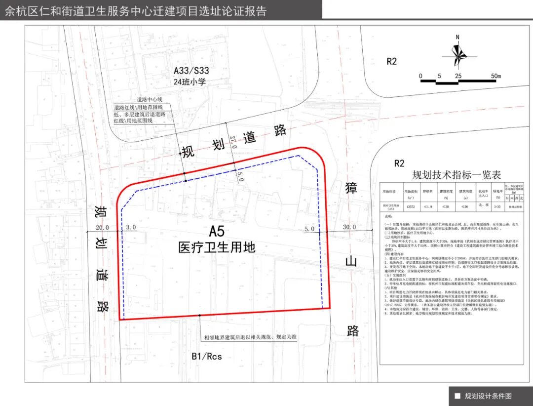◆根据选址论证报告,余杭区仁和街道卫生服务中心迁建项目用地性质为医疗卫生用地(A5),用地面积为13572平方米,容积率≤1.8,建筑密度≤30%,绿地率≥35%,建筑高度≤50米。具体选址位置和规划条件见附图。