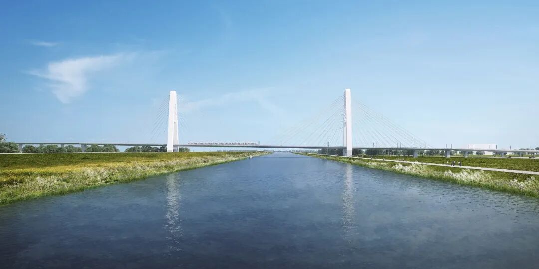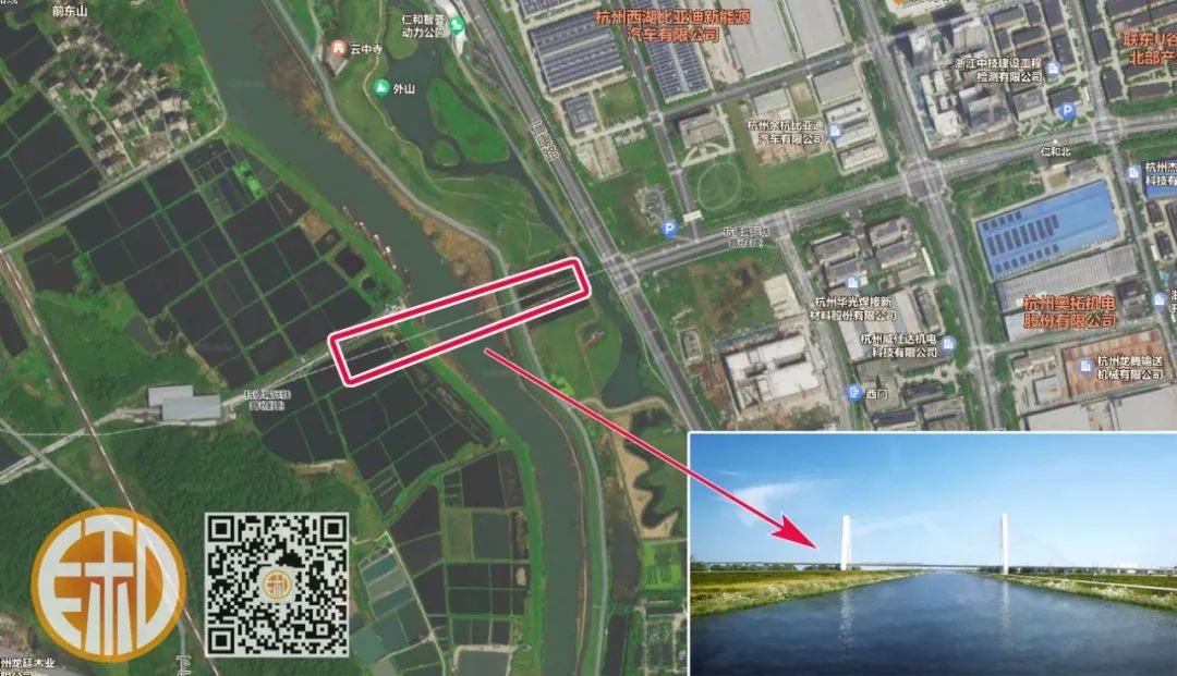 大家都知道吧,杭德市域铁路在“仁和北站”(位于启航路上的芳正国际广场)往德清方向,就开始走高架桥了,而就是以上图片这仁康路西侧开始,沿着地面敷设,且这里是要建一座重要的斜拉桥梁,设计长度440米,桥塔的高度93米。