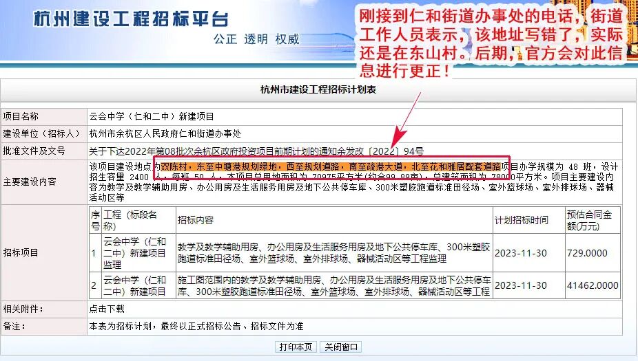 是完全错误的地址!这样的话,招标计划正确的内容,小编推测应该是:仁和街道东山村,东至现状村庄(规划道路和幼儿园),西至仁和大道,南至规划道路,北至规划道路。项目办学规模54班,设计招生容2700人,每班50人,总用地面积65951平方米,98.9265亩。