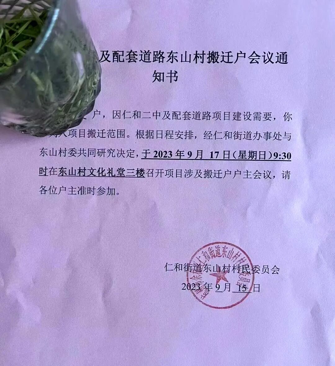据悉,这就是针对仁和二中建设用地东山村毛墩坝的征迁动员。据群友反馈,毛墩坝300多户,此次征迁动员约108户。