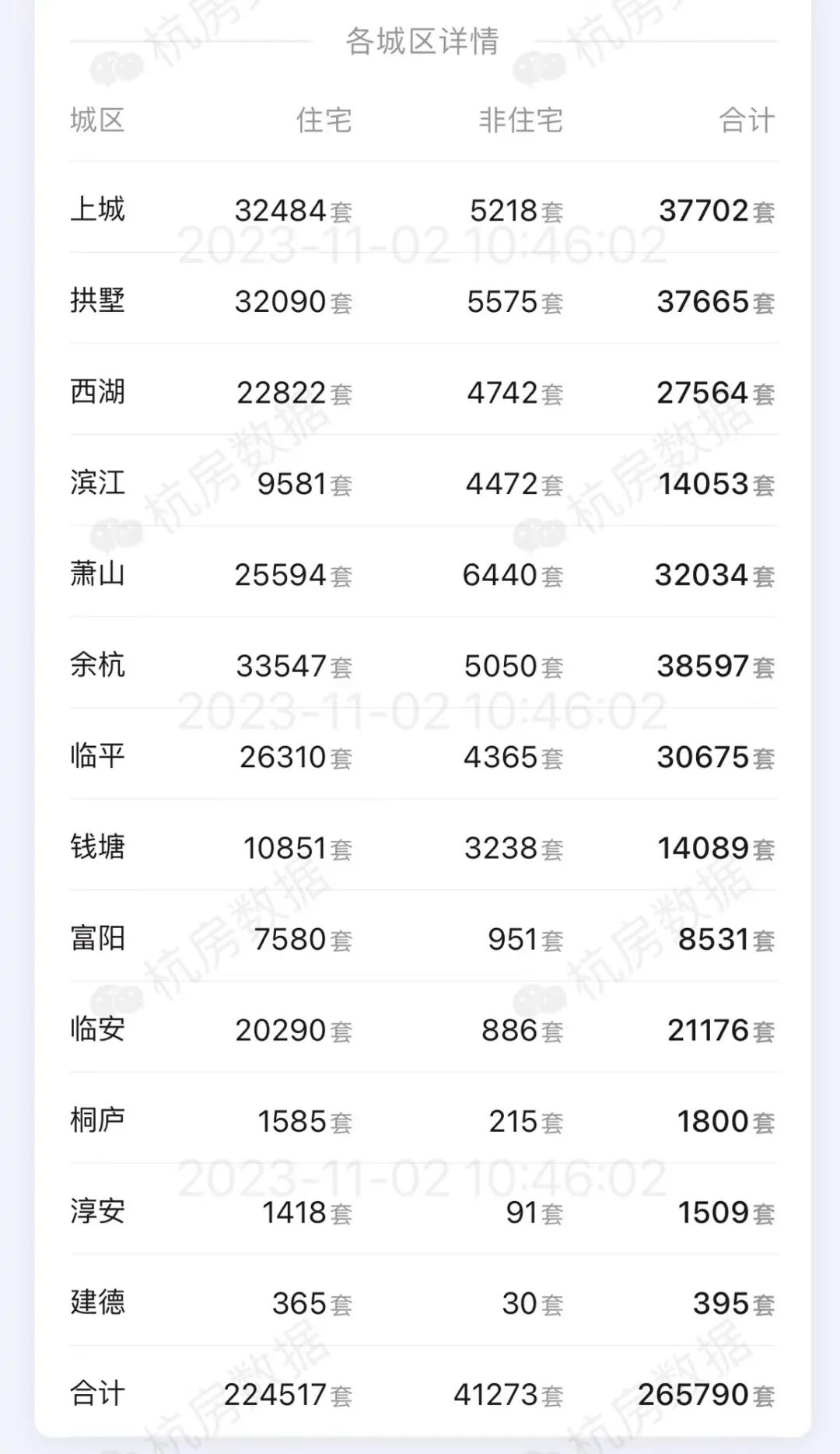 此外,从杭房统计的数据(截至11月2日),包含临安富阳,外加三县市,目前全杭州住宅存量已超过22万套。