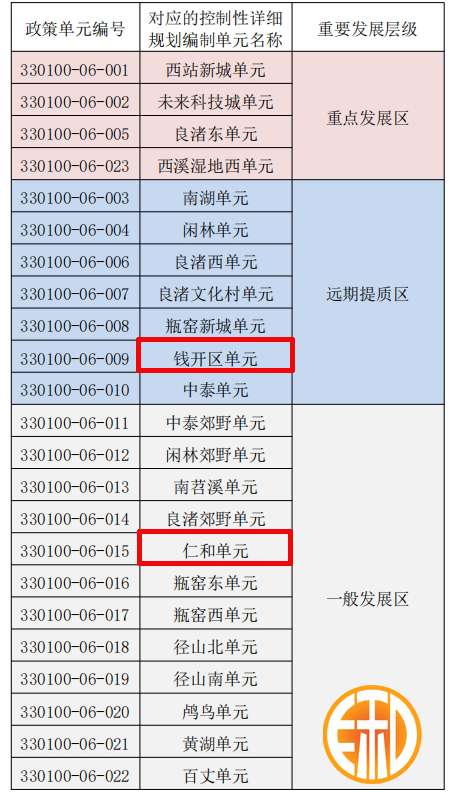 ●其中钱开区单元列为远期提质区,仁和单元列为一般发展区