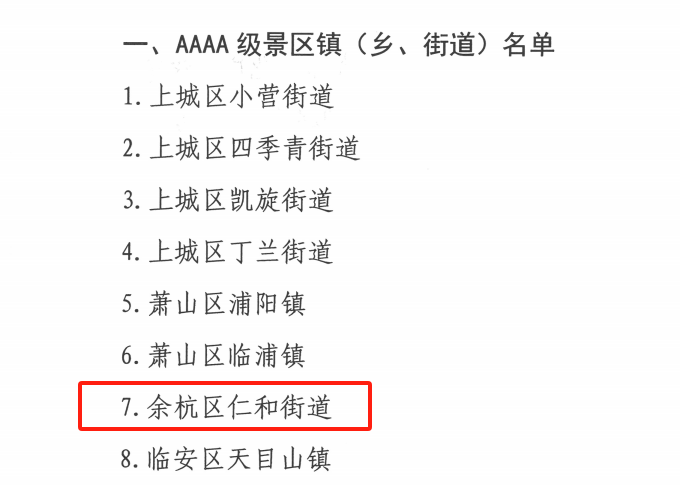 仁和上榜→2023年省级4A级景区镇名单! 得到这个消息,虽然有点晚了,但也不能错过。 消息来源是浙江省文化和旅游厅印发的《关于公布2023年省4A级以上景区城和5A级景区镇(乡、街道)名单的通知》,其中提到余杭区城区成功入选省4A级景区城,良渚街道获评省5A级景区镇(乡、街道)。 另外,根据杭州市文化广电旅游局印发的《关于认定2023年度浙江省景区城和景区镇(乡、街道)的通知》,仁和街道被认定为省4A级景区镇(乡、街道)! 其中,同属于余杭区的良渚街道,获评省5A级景区镇(乡、街道)。 也就是说,仁和街道和良渚街道上榜《2023年5A级景区镇(乡、街道)和4A级景区镇(乡、街道)名单》。 仁和成功创建浙江省4A级景区镇,是哪些方面的出色表现,才获得这个殊荣?一起来看看余杭文旅提到的内容吧。 三白潭、渔公桥村、普宁村、于谦廉政文化陈列馆、智荟动力公园、中共西镇区委旧址、七味咸茶、新大康酱鸭、三白潭青鱼干、仁和八鲜、东塘加工面等等。 完 👨🏻💼图片-撰文-编辑:徐昌国 ▍审核👩🏻💼:李美华 👩🏻💻 资料之一:余杭文旅|余杭2家“景区镇”上新啦!景美好玩有特色,周末打卡安排上~