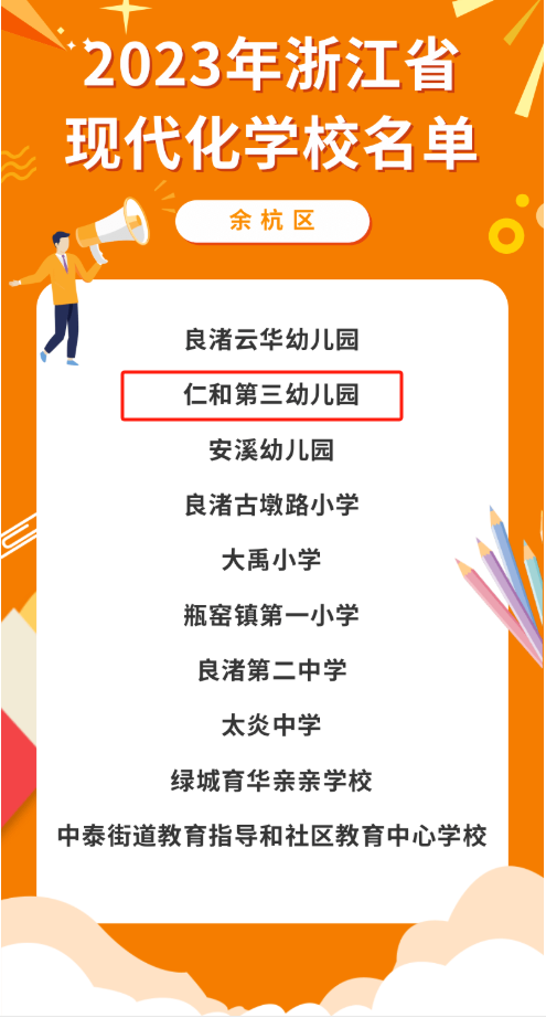 而早在去年12月29日,浙江省教育厅 浙江省人民政府教育督导委员会办公室就关于2023年浙江省现代化学校评估结果进行了公示,最终公布结果是余杭区共有10所学校(幼儿园)上榜,包括仁和街道仁和第三幼儿园(位于云会村,是余杭区第一批浙江省课程改革试点园。)