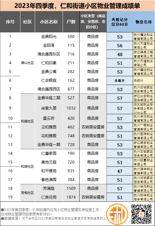 小区物业哪家好?仁和街道2023年四季度物业“成绩单”晒出来~ 根据《关于加强物业管理项目检查考核的通知》(余建〔2022〕55号)等相关要求,2024年2月余杭区已完成2023年第四季度辖区内住宅小区物业管理实地检查工作、住宅物业管理项目季度考核评价工作。主要对服务质量、公共区域管理、车辆有序停放、消防安全管理、应急预案完备、公用设施设备维护、装饰装修管理、公共区域卫生、绿化养护、垃圾分类及清运、防汛抗台、文明创建等方面进行项目检查考核。仁和街道小区物业考核结果如下。 评分数据来源:余杭住建 👩🏻💻 资料:http://www.yuhang.gov.cn/art/2024/2/5/art_1229176299_4239102.html
