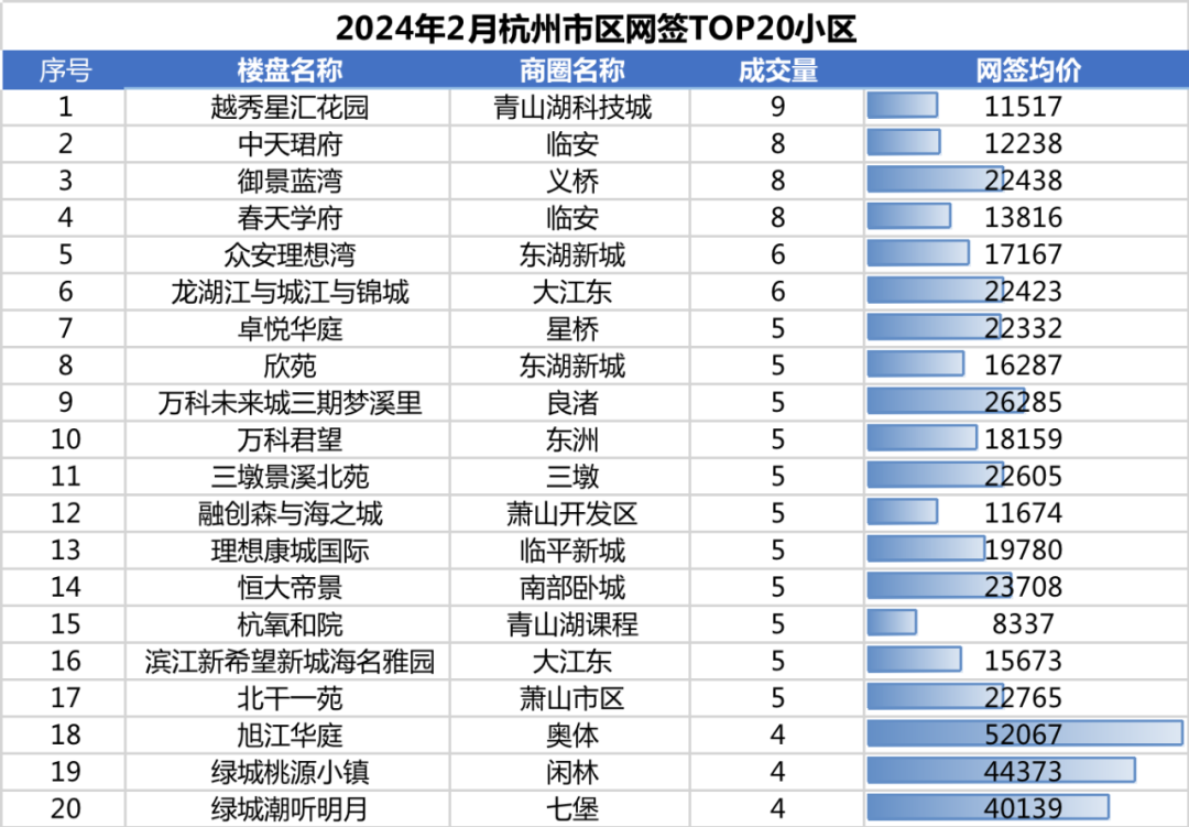 杭州市众多小区中,成交量最多的是越秀星汇花园,成交9套,小区均价仅11517元/㎡!网签TOP20小区,总成交数也才112套。
