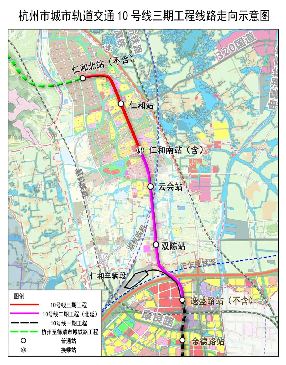 杭德市域铁路线路全长约25.6公里,其中德清境内24.6公里、余杭境内1公里,设计时速120公里;线路分高架、地下两种方式敷设,全线设9座车站(仁和北站、八字桥站、下渚湖站、地信小镇站、莫干山高新区站、千秋广场站、体育中心站、浙工大站、德清高铁站),并且接驳杭州地铁10号线,预计2026年建成。