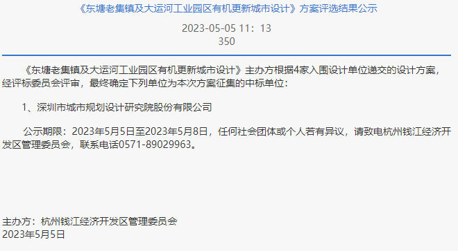 再缕下时间线。2023年3月28日,余杭区政府网发布《东塘老集镇及大运河工业园区有机更新城市设计》征集公告。2023年5月公示中标单位:深圳市城市规划设计研究院股份有限公司。