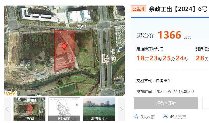 5月27日,省自然资源网上交易中心上线了余政工【2024】6号地块(浙江余杭经济开发区奉欣路以南工业地块(C-2)西),面积为15169平方米(22.753亩) 起始价 1366万元