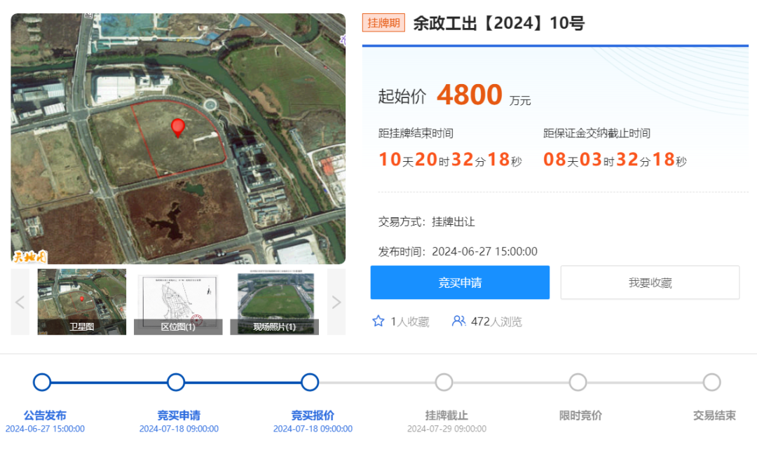 6月27日,省自然资源网上交易中心上线了余政工出【2024】10号地块(临港路以南工业地块五(C-70)),面积为53333平方米(79.999) 起始价 4800万元。