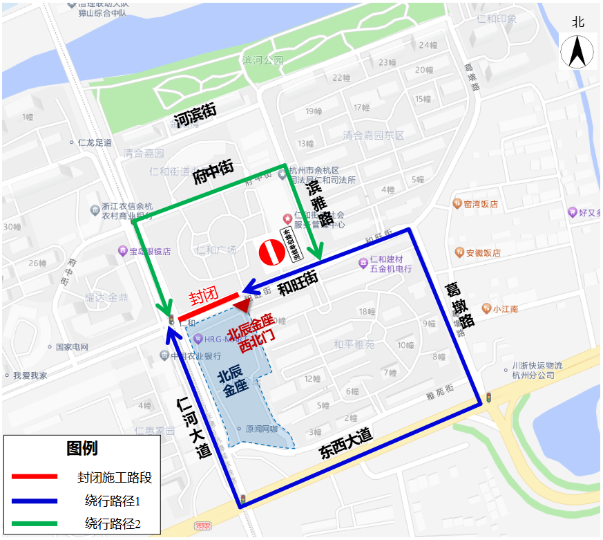 自2024年7月31日起至2026年9月30日,和旺街(仁河大道-北辰金座西北门)段全封闭施工,禁止一切车辆及行人通行,过往车辆及行人通过葛墩路、滨雅路、府中街等道路通行。