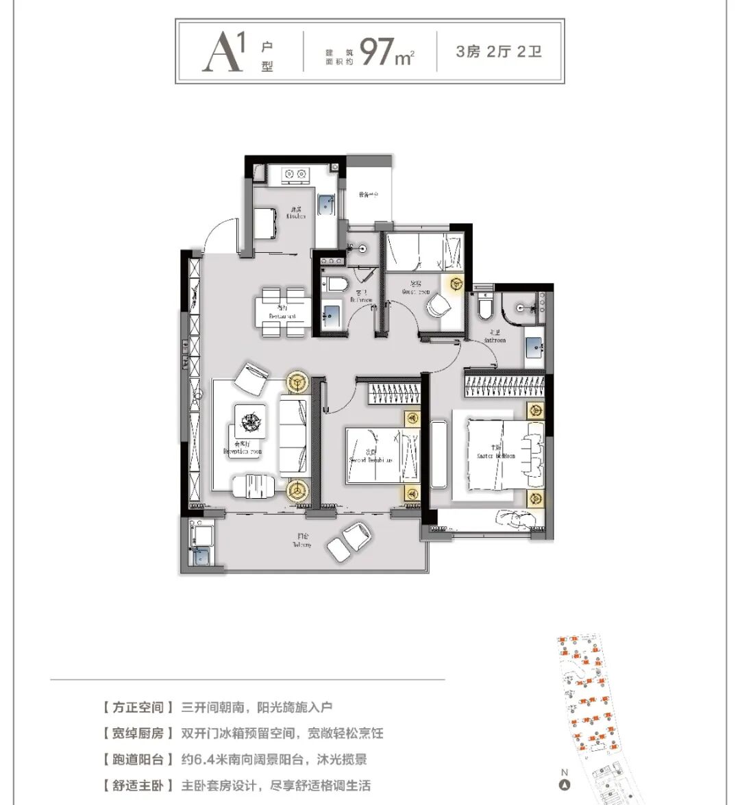 其中最小的户型建面约97㎡,做到了三开间朝南,拥有6.4米的南向超宽阳台。户型虽小,主卧也设计成了套房,两个卫生间的设计,甚至能满足三代人一同居住的需求。