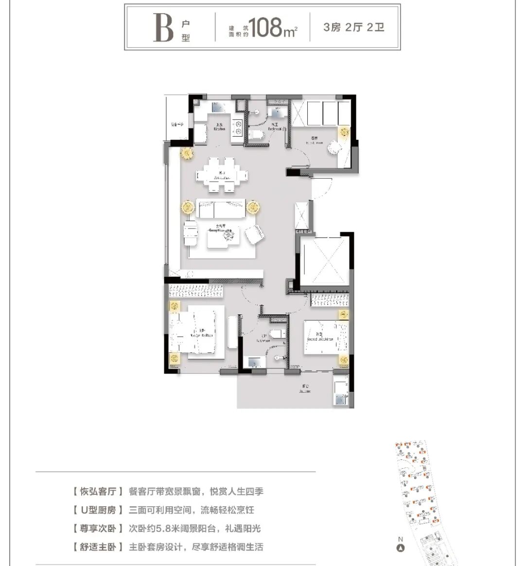 建面约108㎡户型就略带一些改善的意味了。高端项目常见的大边厅,营造了客厅、餐厅、厨房开放打通的“LDK一体化”模式,使空间感更加通透。U形厨房让动线更加流畅顺滑,尺度感甚至可以和市场上一些改善产品不相上下。