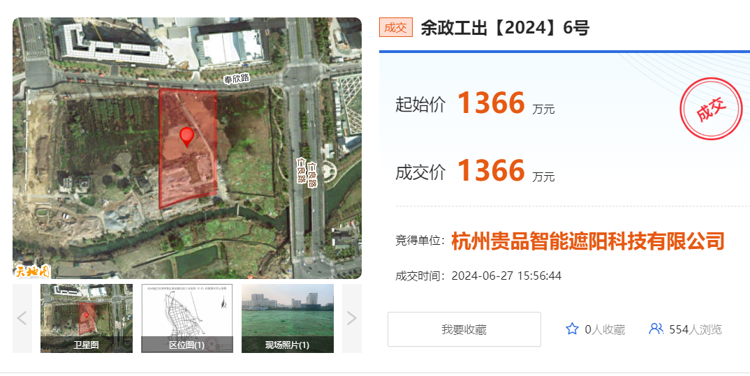 这个余政工出【2024】6号地块(杭州钱江经济开发区奉欣路以南工业地块(C-2)西),位于余杭区经济开发区,北临奉欣路,南临河道北侧绿化带。面积15169平方米(22.753亩),以起始价1366万元成交。成交均价为900元/平方米